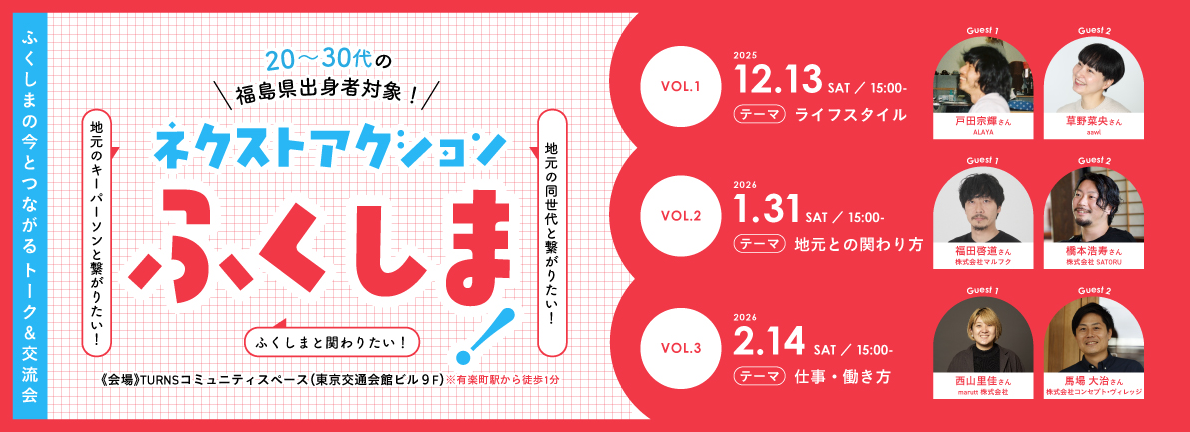 | お問合せ先 | 「ただいま、ふくしま。2025 in 東京」 運営事務局 (株式会社イダテン内) TEL 024-572-6404 MAIL info@fukushima-uturn-event.com |